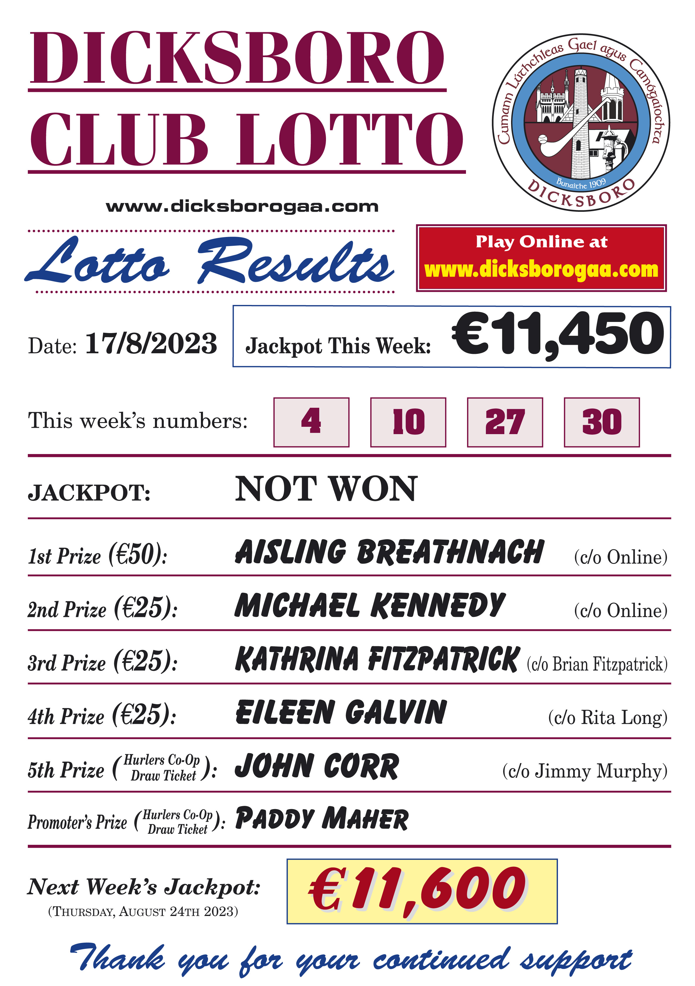 Dicksboro Dicksboro Lotto Results 17th August 2023 Very well made.