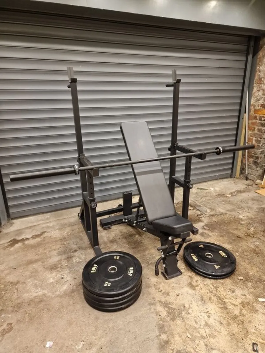 Weight bench rack Olympic bar and 50kg weights set As New for Very well made.